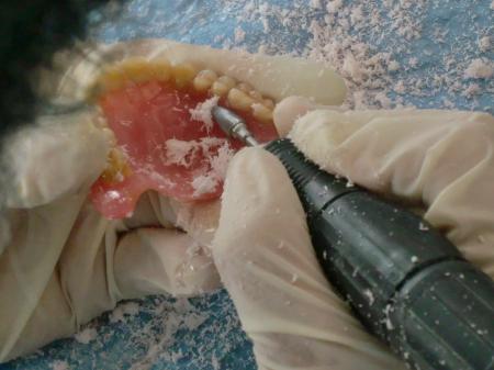 作業内容としては、まず義歯にネームを埋めていくために義歯を削る作業をし