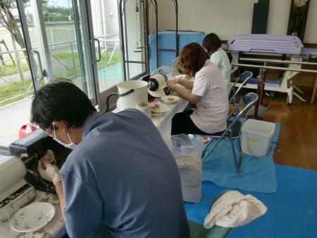 皆さん体が汚れながらも一生懸命作業をこなしてくれて何事もなく順調に約90床もの義歯にネームを入れることができました。今回は、作業効率がよく掃除まで入れて約2時間半で終わらせることができました。